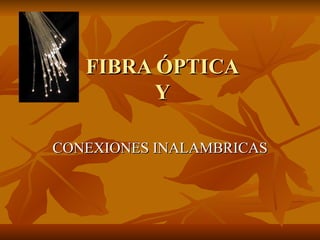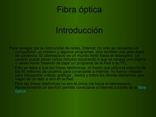 Este documento describe las ventajas de la fibra óptica y las conexiones inalámbricas para la transmisión de datos. La fibra óptica permite mayores velocidades y distancias de transmisión que las líneas telefónicas. Las conexiones inalámbricas pueden utilizarse para extender el acceso a Internet a lugares remotos. El documento también explica diferentes tipos de redes inalámbricas y sus aplicaciones.