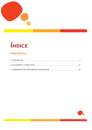 La fibra óptica consiste en un fino filamento de vidrio o plástico que guía la luz a lo largo de su longitud. Funciona mediante la reflexión interna total de la luz dentro del núcleo de la fibra. En un sistema de fibra óptica, un transmisor convierte las señales eléctricas en luz, que se transmite a través de la fibra, y un receptor convierte la luz de nuevo en señales eléctricas. La fibra óptica ofrece mayores velocidades de transmisión y puede transportar más