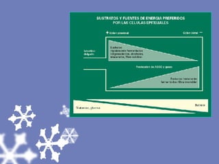 La fibra dietética se compone de macromoléculas vegetales no digeribles como celulosa, hemicelulosa, pectinas y lignina. Existen dos tipos: la fibra soluble, que absorbe agua, y la insoluble. La fibra soluble aumenta el volumen de las heces y reduce la presión intestinal, mientras que la insoluble atrapa agua y sales biliares. Ambas tipos de fibra son fermentadas por bacterias intestinales, lo que genera ácidos grasos de cadena corta como el butirato, fuente principal de energía para las cél