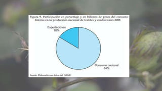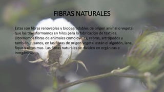 Este documento trata sobre las fibras naturales de origen animal y vegetal que se usan para fabricar textiles en Colombia. Describe las principales fibras como algodón, lino y fique, e indica que se cultivan más de 114 especies vegetales para extraer fibras. Explica las zonas de siembra y producción del algodón, fique y caña de azúcar, y cómo el sector textil contribuye con el 10.3% del PIB manufacturero colombiano y genera 600 mil empleos.