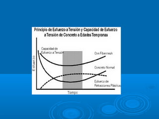 El documento describe las fibras de polipropileno FIBRATEX que se usan como refuerzo secundario en el concreto. FIBRATEX son fibras monofilamentos de polipropileno que se dispersan completamente en la mezcla de concreto para reducir agrietamiento y aumentar la durabilidad a largo plazo. Las fibras de FIBRATEX mejoran las propiedades del concreto fresco y endurecido al controlar fisuras y aumentar resistencia a la flexión y compresión.