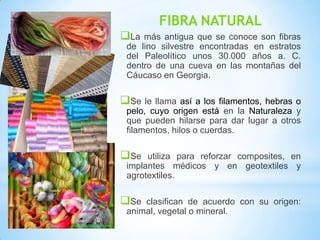 Las fibras naturales más antiguas conocidas son fibras de lino encontradas en una cueva en Georgia hace 30,000 años. Las fibras naturales son filamentos o pelos que provienen de la naturaleza y que pueden hilarse para crear hilos o cuerdas. Se clasifican según su origen animal, vegetal o mineral y se utilizan para reforzar materiales compuestos e implantes médicos.
