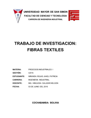 Este documento presenta información sobre diferentes tipos de fibras textiles. Se divide las fibras en dos grupos: fibras naturales y fibras manufacturadas. Las fibras naturales incluyen fibras de origen animal como la seda y la lana, y fibras de origen vegetal como el algodón y el lino. Las fibras manufacturadas son fibras artificiales como el rayón y fibras sintéticas como el poliéster y el nylon. Además, identifica los sectores industriales textiles más importantes y su uso en la confección de ropa.