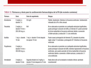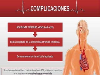 Este documento describe la fibrilación auricular, una arritmia cardiaca común. Define la fibrilación auricular, discute su prevalencia y factores de riesgo, y describe los métodos de diagnóstico y tratamiento. El tratamiento se centra en controlar la frecuencia cardiaca, restaurar el ritmo sinusal cuando sea apropiado, y prevenir eventos tromboembólicos mediante anticoagulación.