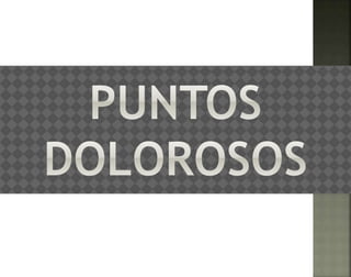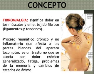 La fibromialgia se caracteriza por dolor crónico generalizado, fatiga y problemas de memoria y estado de ánimo. Se cree que se debe a una función anormal del sistema nervioso central que causa una amplificación de las señales de dolor. Afecta principalmente a mujeres entre 30 y 50 años y se asocia con estrés, traumas y enfermedades. Los síntomas incluyen dolor muscular, rigidez, cefalea y problemas del sueño. El tratamiento incluye masajes, calor, ejercicio y medicamentos para aliviar el dolor y la