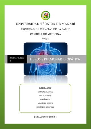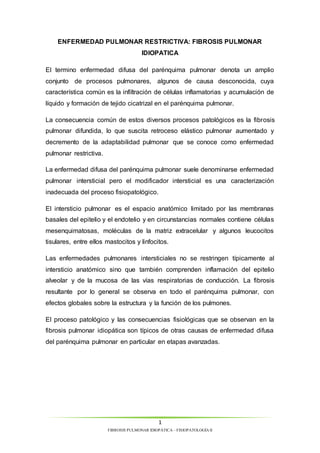 La fibrosis pulmonar idiopática es una enfermedad pulmonar restrictiva crónica de causa desconocida que se caracteriza por inflamación y fibrosis progresiva del parénquima pulmonar. Los síntomas incluyen disnea progresiva y tos seca persistente. Los exámenes revelan patrón restrictivo en las pruebas de función pulmonar, opacidades reticulares en la tomografía de tórax, y reducción de la capacidad de difusión pulmonar. No existe cura y la evolución suele ser hacia el empeoramiento progres
