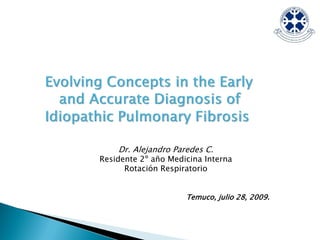 Este documento resume la Fibrosis Pulmonar Idiopática (IPF), incluyendo su definición, prevalencia, importancia del diagnóstico temprano, criterios diagnósticos, hallazgos clínicos, de laboratorio e imagenológicos, y concluye enfatizando la necesidad de un enfoque multidisciplinario para el diagnóstico de IPF.