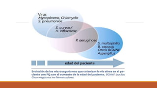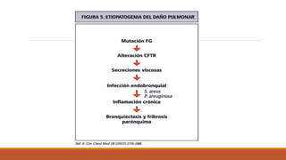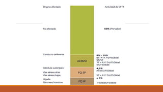 La fibrosis quística es una enfermedad genética hereditaria que afecta principalmente los pulmones y el páncreas. Se hereda de forma autosómica recesiva y se debe a mutaciones en el gen CFTR que codifica un canal de cloro. Esto produce secreciones anormalmente espesas que obstruyen los pulmones y dificultan la digestión. El diagnóstico se realiza mediante el test de sudor o estudios genéticos. El tratamiento incluye kinesiterapia respiratoria, antibióticos y nutrición para mejor