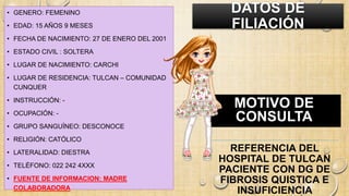 Este documento presenta los datos de filiación y la historia clínica de una paciente femenina de 15 años y 9 meses con diagnóstico de fibrosis quística. Describe sus antecedentes personales patológicos que incluyen múltiples hospitalizaciones por neumonía desde los 2 años. Actualmente presenta un neumotórax derecho y se encuentra hospitalizada. El resumen brinda información sobre la condición de la paciente y su diagnóstico de fibrosis quística.