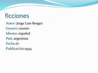 Este documento resume la obra Ficciones de Jorge Luis Borges. La obra está compuesta de dos partes, El jardín de los senderos que se bifurcan y Artificios. El jardín de los senderos que se bifurcan contiene 8 cuentos y Artificios contiene 6 cuentos. Algunos de los cuentos resumidos son "Tlön, Uqbar, Orbis Tertius", "El acercamiento a Almotásim", "Lotería en Babilonia" y "Funes el memorioso".