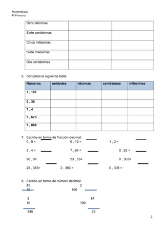 Este documento presenta una serie de ejercicios sobre fracciones decimales para estudiantes de 4o grado de primaria. Los ejercicios incluyen identificar fracciones decimales, escribir fracciones como decimales y viceversa, relacionar unidades, décimas, centésimas y milésimas, ordenar números decimales y más. El objetivo es que los estudiantes practiquen los conceptos básicos de fracciones decimales a través de diferentes tipos de problemas.