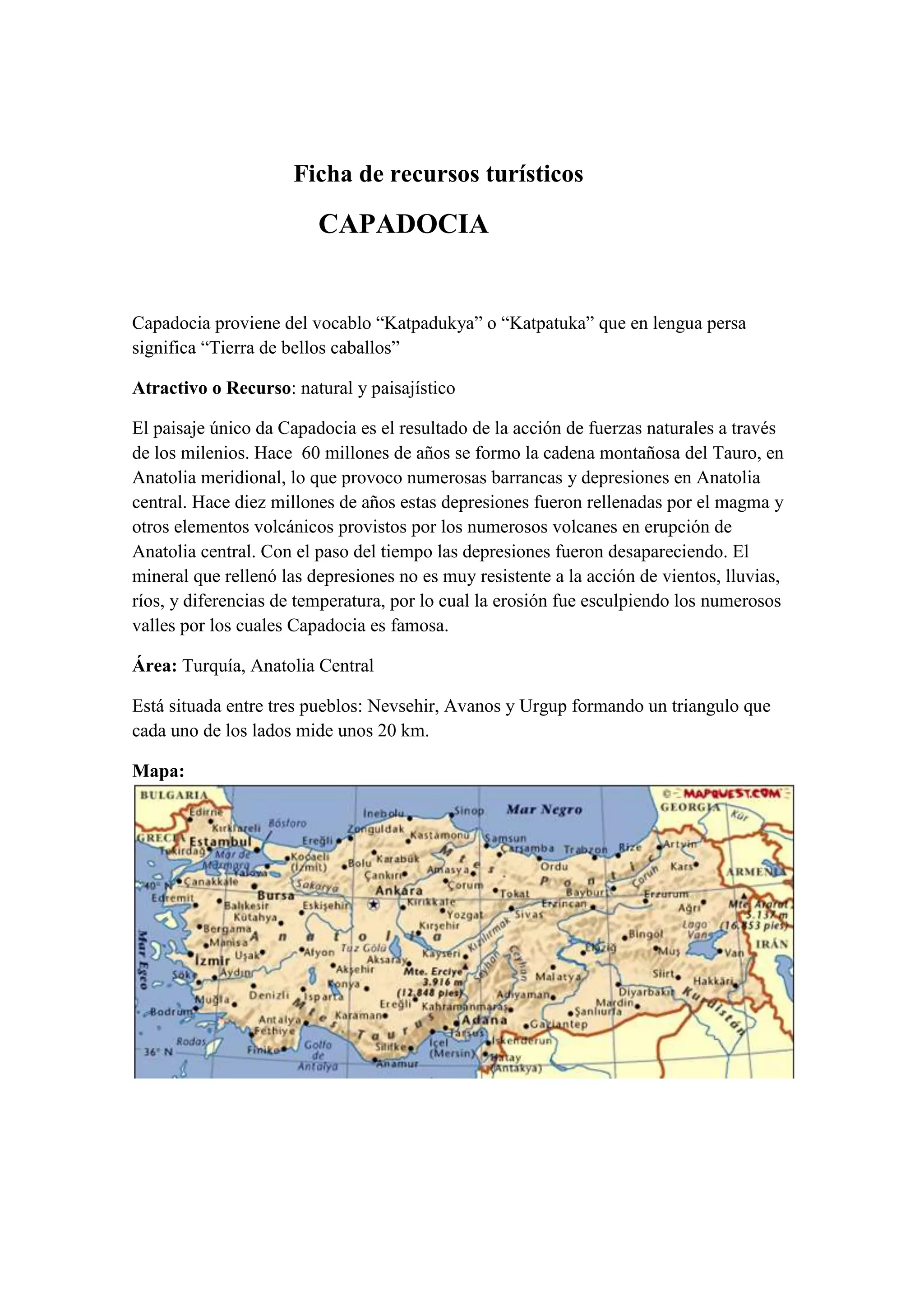 Capadocia es una región de Turquía conocida por sus únicos paisajes de formaciones rocosas esculpidas por la erosión. La acción volcánica hace millones de años creó depresiones rellenadas con toba que con el tiempo fue esculpiendo valles y formas caprichosas. La gente excavó cuevas y ciudades subterráeas enteras para refugiarse. Actualmente es un importante destino turístico internacional por sus paisajes lunares, iglesias bizantinas excavadas en roca y actividades como globos aerostáticos.