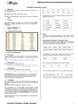 Este documento describe diferentes tipos de combinaciones vocálicas en español, incluyendo diptongos, triptongos e hiatos. Explica que los diptongos ocurren cuando dos vocales se unen en una sola sílaba, los triptongos cuando tres vocales se unen, y los hiatos cuando dos vocales separadas están en la misma palabra pero en sílabas diferentes. Además, discute reglas de acentuación cuando estos fenómenos ocurren y provee ejemplos. Finalmente, incluye ejercicios prácticos para