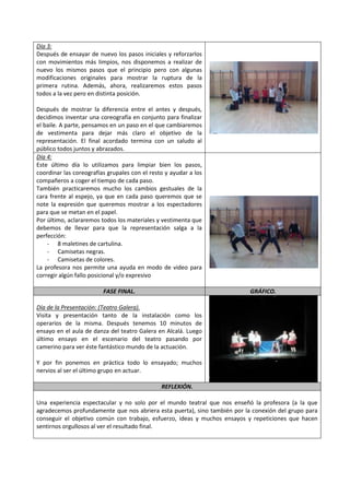 El documento describe el proceso de creación de una coreografía de danza por un grupo de estudiantes para representar un texto de Albert Einstein. A lo largo de 7 horas de sesiones, el grupo decidió titular su coreografía "Breaking the Routine" e inspirarse en romper con la rutina diaria. Desarrollaron los pasos de baile en forma de canon por parejas y coordinaron las diferentes secciones musicales. Finalmente, presentaron con éxito su coreografía en el Teatro Galera después de varios ensayos.