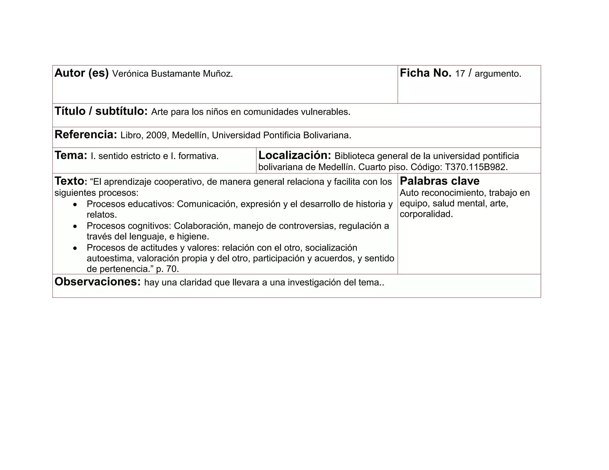 El documento habla sobre el uso del arte para niños en comunidades vulnerables. Explica que el aprendizaje cooperativo a través del arte facilita procesos educativos como la comunicación, expresión y desarrollo de historias, así como procesos cognitivos como la colaboración y regulación a través del lenguaje. También ayuda a desarrollar actitudes y valores positivos como la relación con los demás, la autoestima, la participación y el sentido de pertenencia.
