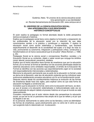 El documento explica la pedagogía social y la educación social desde perspectivas teóricas e históricas. Define la pedagogía social como la ciencia que prepara a los profesionales de la educación para mejorar la práctica a través de la formación. Define la educación social como una acción sistemática que promueve la autonomía, integración y participación crítica de los sujetos a lo largo de su vida. También distingue entre educación formal e informal, siendo la formal aquella planificada por los sistemas educativos y la informal