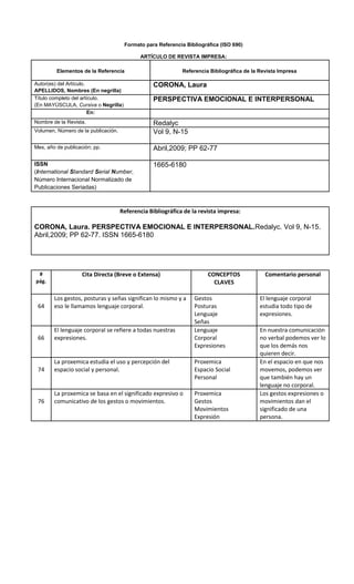 El documento presenta el formato para referenciar documentos electrónicos y artículos de revista en línea y revistas impresas de acuerdo a la norma ISO 690-2. Explica los elementos necesarios para crear referencias bibliográficas completas como el autor, título, nombre de la publicación, volumen, número, páginas, URL, ISSN. Además, incluye ejemplos de referencias bibliográficas correctamente formateadas de acuerdo a la norma para un artículo de revista en línea y uno impreso.