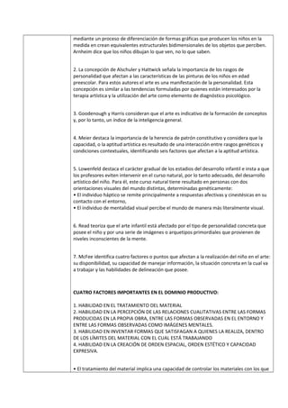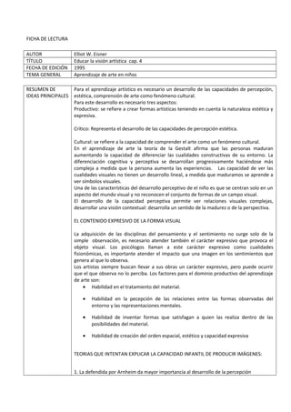 Este documento resume las ideas principales de Elliot W. Eisner sobre el aprendizaje artístico en niños. Discute tres aspectos clave del desarrollo artístico: productivo, crítico y cultural. También analiza varias teorías sobre la capacidad de los niños para producir imágenes y destaca cuatro factores importantes para el dominio productivo del arte: habilidad con materiales, percepción de formas, invención de formas y creación de orden y expresión. Además, contrasta el arte pictográfico y representativo y tres