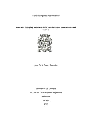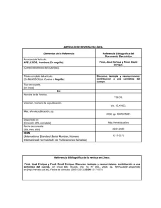 Este documento presenta un resumen y referencia bibliográfica de un artículo académico publicado en la revista en línea TELOS en 2008. El artículo, titulado "Discurso, isotopía y neonarcisismo: contribución a una semiótica del cuerpo", analiza la relación entre el cuerpo, el dolor y las prácticas culturales a través de una perspectiva semiótica. El resumen incluye la ficha bibliográfica del artículo, así como tres extractos clave del contenido con sus respectivas páginas y