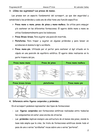 El acrosport es un deporte acrobático-coreográfico que integra formaciones pirámides humanas, habilidades gimnásticas y música. Se divide en acróbatas, portores y ayudantes, y requiere comunicación, presas de manos seguras y seguir las fases de construcción, estabilización y desenlace de las pirámides. Para practicarlo con seguridad se debe usar superficies acolchadas, ropa adecuada y seguir normas como apoyos seguros y mantener la espalda recta.