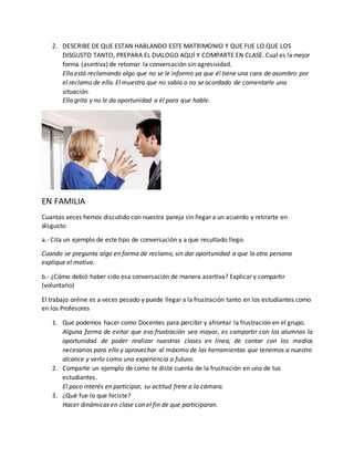 El documento aborda la importancia de la comunicación asertiva en el proceso de enseñanza-aprendizaje, resaltando su papel en la interacción efectiva entre docentes y estudiantes. También presenta un caso de dualidad de mando en un hospital, donde un director intenta retener a un cardiólogo valioso, pero se enfrenta a la negativa del contador debido a normativas internas. Se plantean preguntas y estrategias sobre cómo manejar la frustración y mejorar la comunicación para evitar conflictos en entornos educativos y laborales.