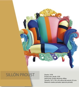 Alessandro Mendini diseñó el icónico sillón Proust en 1978. Cubrió una butaca neobarroca del siglo XVIII con puntos de colores que reproducían una pintura puntillista, combinando impresionismo y barroco. El sillón cuestiona los principios del buen diseño al saturarlo de ornamentación, convirtiéndose en un símbolo del "diseño banal" de Mendini.