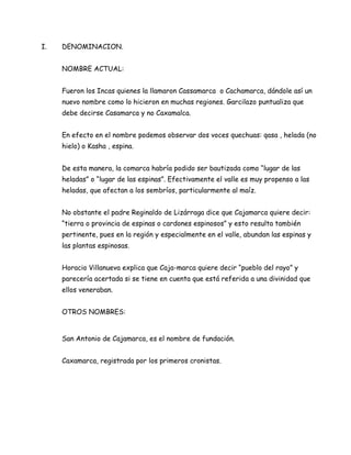 El documento proporciona información sobre la ciudad de Cajamarca, Perú. Resume su ubicación geográfica a 2,750 metros sobre el nivel del mar, con una extensión de 392.47 km2 y una temperatura promedio de 13°C. Explica que los Incas la llamaron originalmente Cassamarca o Cachamarca y que su nombre actual podría significar "lugar de las heladas", "lugar de las espinas" o "pueblo del rayo". Además, brinda detalles sobre su fundación española en 1532 y su des