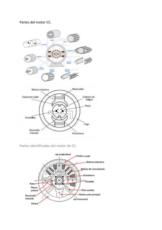 El documento identifica y define las partes principales de una máquina eléctrica, incluyendo el inductor, la pieza polar, el núcleo, el devanado inductor, la expansión polar, el polo auxiliar, la culata, el inducido, el devanado inducido y el colector. También describe brevemente el entrehierro, el espacio entre la expansión polar y el inducido, normalmente de 1 a 3 mm.