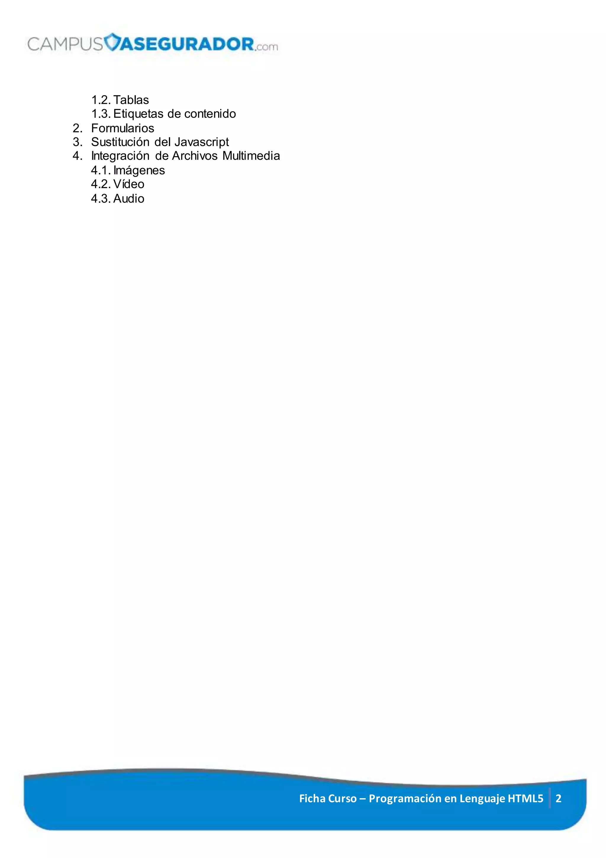 Este curso de 45 horas enseña las habilidades necesarias para crear páginas web usando HTML5. Cubre la sintaxis y estructura básica de HTML5, así como temas relacionados como CSS y PHP. Los módulos explican la evolución de HTML5, la estructura básica de páginas web, y cómo gestionar contenido mediante etiquetas, tablas, formularios y archivos multimedia. El objetivo es preparar alumnos para diseñar sitios web profesionales usando HTML5.