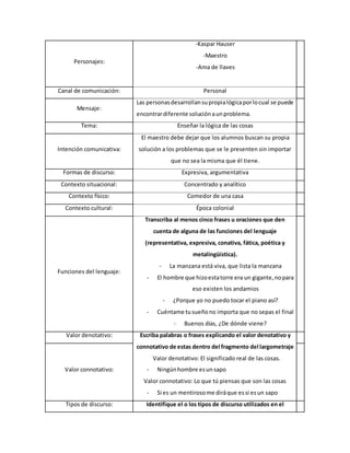 Este resumen describe una escena de la película "El enigma de Kaspar" de Werner Herzog. La escena tiene lugar en el comedor de una casa colonial y presenta una conversación entre Kaspar, el maestro y el ama de llaves. El maestro le enseña a Kaspar que las personas desarrollan su propia lógica y pueden encontrar diferentes soluciones a un problema, y que debe dejar que los estudiantes encuentren sus propias soluciones sin importar si son diferentes a las suyas.
