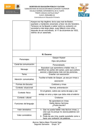 1) La escena se desarrolla entre Gaspar Hauser y los hijos de un profesor, quienes intentan enseñarle a Gaspar a hablar mediante rimas.