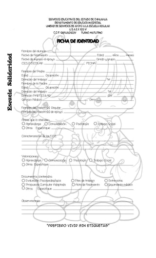 Este documento contiene información personal de un alumno, incluyendo su nombre, fecha de nacimiento, edad, fecha de ingreso al apoyo, grado y grupo, datos de sus padres, domicilio, servicio médico, maestros regulares y de apoyo, áreas que lo atienden, caracterización de necesidades educativas especiales, valoraciones, documentos contenidos y observaciones.
