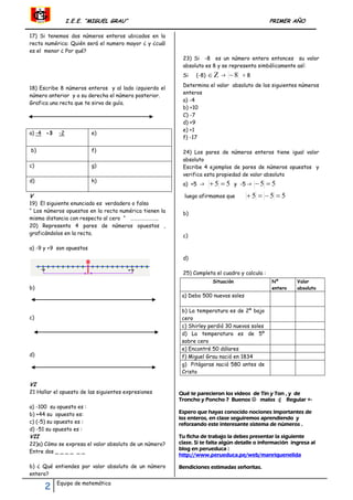 El documento presenta una ficha de trabajo sobre los números enteros. Introduce los personajes Tin y Ton y Troncho y Poncho, quienes enseñan sobre este sistema de números a través de videos divertidos. La ficha contiene 25 preguntas sobre conceptos como números enteros, operaciones con ellos, recta numérica, números opuestos y valor absoluto. Al final invita a las estudiantes a completar la ficha y revisar el blog para más información.
