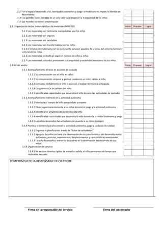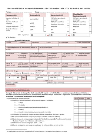 Este documento presenta una ficha de monitoreo para evaluar el componente educativo de los servicios de atención a niños de 0 a 3 años. La ficha incluye secciones para recopilar información general sobre el servicio y evaluar dos dimensiones: la organización práctica pedagógica del espacio y los materiales, y el rol del adulto en el acompañamiento de los niños. Se evalúan aspectos como la limpieza, ventilación e iluminación del espacio; la seguridad y potencial educativo de los materiales; y la calidad de la