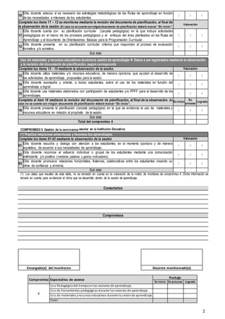 Este documento proporciona una ficha de monitoreo para observar una sesión de aprendizaje. La ficha incluye secciones para registrar datos de identificación de la institución educativa, del observador y de la sesión; una matriz para monitorear el uso pedagógico del tiempo, las herramientas pedagógicas y los materiales durante la sesión; y un área para comentarios. El propósito es monitorear el cumplimiento de compromisos relacionados con la planificación, ejecución y gestión de la conv
