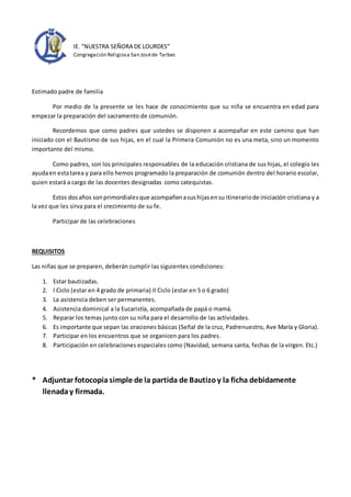 La carta es de una escuela religiosa informando a los padres que sus hijas han alcanzado la edad para prepararse para el sacramento de la Primera Comunión. La carta explica que los padres son responsables de la educación cristiana de sus hijas y que la escuela los ayudará con la preparación que se llevará a cabo durante el horario escolar. También enumera los requisitos que las niñas deben cumplir para la preparación como asistir a misa, conocer oraciones básicas y que los padres participen en los encuent