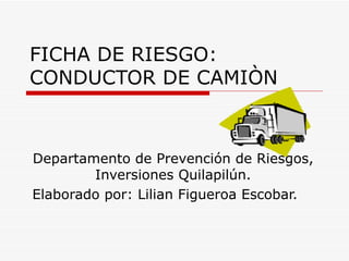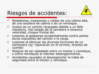 El documento detalla los riesgos asociados al trabajo de un conductor de camión, incluyendo accidentes por caídas, vuelcos, lesiones por impacto, y exposición a sustancias químicas. También se mencionan factores de estrés y condiciones ergonómicas que afectan la salud, así como medidas preventivas para mitigar estos riesgos. Se enfatiza la importancia de que los conductores sean conscientes de sus limitaciones y mantengan alerta durante la conducción.