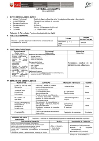 Este documento presenta la actividad de aprendizaje No. 02 de la asignatura de Reparación de equipos de computo. La actividad se centra en los fundamentos de electrónica digital y se desarrollará a lo largo de 3 semanas con 6 horas de duración cada una. Los contenidos incluyen sistemas de numeración, compuertas lógicas y su aplicación práctica mediante el armado de circuitos electrónicos. El aprendizaje se logrará a través de métodos como explicación, demostración práctica, resolución