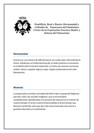 La Hermandad y Cofradía de Nazarenos del Santísimo Cristo de la Expiración Nuestra Madre y Señora del Patrocinio cuenta con 200 hermanos, 120 de los cuales visten la túnica negra durante las procesiones. La corporación se fundó a principios del siglo XIX para rendir culto a las imágenes del Cristo de la Expiración y Nuestra Señora del Patrocinio en la Basílica del Cristo de la Expiración. El escudo de la hermandad incluye una corona real soportada por dos