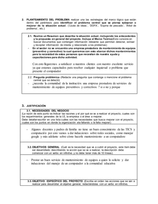 Este documento presenta un proyecto para crear una empresa prestadora de servicios de mantenimiento de computadores. El proyecto busca satisfacer la necesidad de mantenimiento de equipos en la comunidad educativa y dar capacitaciones sobre el uso básico de computadores. El proyecto será ejecutado por 5 estudiantes y brindará servicios de mantenimiento preventivo, correctivo e inducciones a docentes, padres de familia y la comunidad en general.