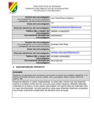 Este proyecto busca diseñar un prototipo de carrito a pequeña escala impulsado por energía solar para superar diferentes obstáculos. Los estudiantes investigarán los materiales y componentes más adecuados, diseñarán esquemáticamente el carrito y analizarán el rendimiento del prototipo al superar los obstáculos, con el fin de mejorar su diseño y llevarlo a una escala mayor para reducir la contaminación.