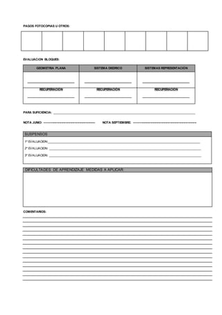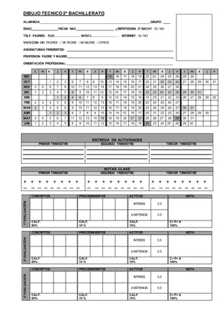 Este documento es un formato para registrar la información de un estudiante de segundo año de bachillerato en la asignatura de dibujo técnico. Incluye secciones para documentar los datos personales del estudiante, asignaturas pendientes, calendario escolar, evaluaciones trimestrales, notas y comentarios adicionales.