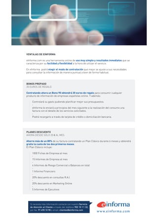 eInforma es una marca de Informa D&B que nace con el objetivo de acercar información relevante para la toma de decisiones, al mundo del profesional y la PYME. eInforma ofrece los siguientes servicios: Informes de empresas, Informes de autónomos, Informes de particulares, Informes de Ejecutivos, Listados de Marketing, Estudios Sectoriales, Valoración de empresas, Valoración de viviendas...