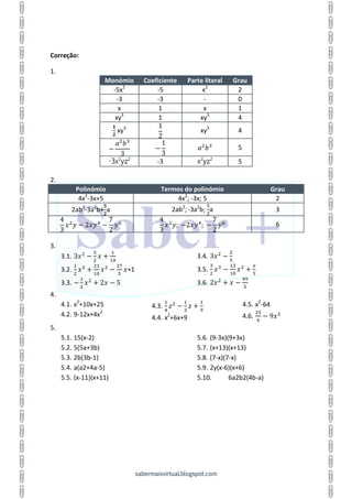 El documento presenta ejercicios de matemáticas relacionados con monomios y polinomios para el octavo año, incluyendo la clasificación de monomios, la reducción de polinomios, y la factorización. Se incluyen ejemplos de casos notables de multiplicación y sus respectivas factorizaciones. Además, se proveen correcciones detalladas para los ejercicios propuestos.