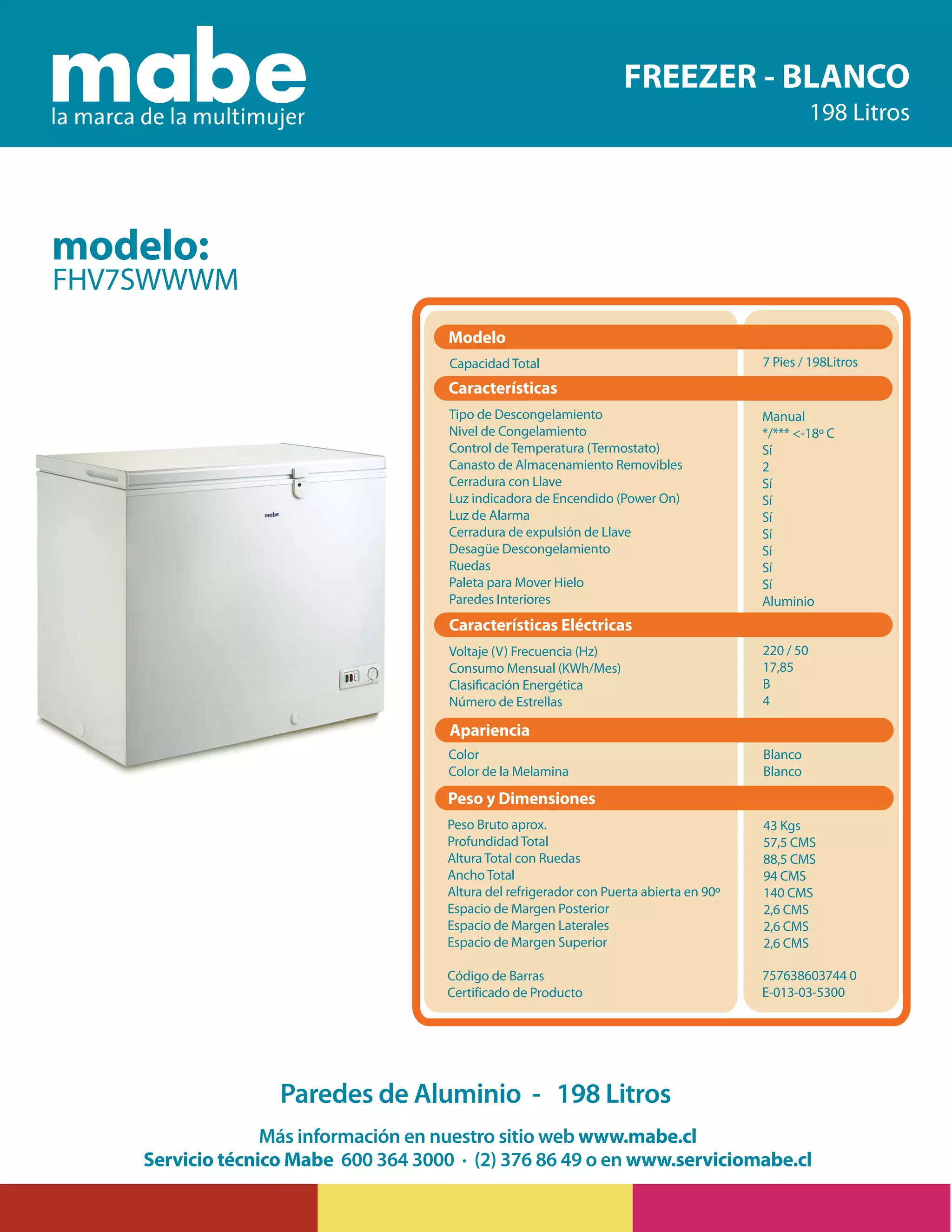 Este documento proporciona información sobre un congelador blanco de 198 litros. Incluye detalles sobre su capacidad, características, especificaciones eléctricas, dimensiones y código de barras. El congelador tiene dos canastas removibles, cerradura con llave, luz indicadora y desagüe para descongelamiento. Mide 88.5 cm de alto y 94 cm de ancho, con un consumo mensual estimado de 17.85 kWh.