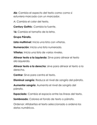 El documento describe las funciones de varias herramientas de formato de texto en un procesador de palabras, incluyendo opciones para pegar, cortar y copiar contenido, aplicar formatos de fuente como negrita, cursiva y subrayado, y ajustar el tamaño y color de fuente, así como funciones de alineación, sangría, estilos y búsqueda/reemplazo de texto en un documento.