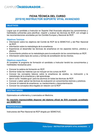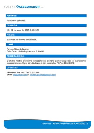 Este documento proporciona información sobre un curso de Instructor de Soporte Vital Avanzado. El objetivo del curso es capacitar a los candidatos para enseñar técnicas de RCP de acuerdo con las recomendaciones europeas y nacionales. El curso se dirige a enfermeros y médicos con certificación en SVA y se llevará a cabo durante dos días en mayo en la Escuela Militar de Sanidad en Madrid. El curso cuesta 400 euros por estudiante y proporciona acreditación a través del Plan