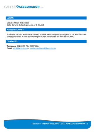 Este documento proporciona información sobre un curso de instructor de soporte vital avanzado en trauma. El curso tiene como objetivo enseñar a los candidatos a instructor los conocimientos y habilidades necesarias para impartir técnicas de RCP de acuerdo con las recomendaciones europeas y nacionales. El curso dura dos días y cuesta 400 euros por alumno. Está dirigido a enfermeros diplomados y médicos licenciados que ya tengan el diploma de soporte vital avanzado en trauma.