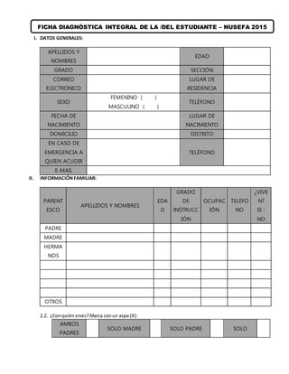 Este documento recopila información personal, familiar, económica, de salud y educativa de un estudiante. Incluye secciones sobre datos generales, información familiar, laboral y económica, vivienda, salud, alimentación, cognitiva, emocional, social y personal del estudiante. El propósito es realizar un diagnóstico integral del estudiante.