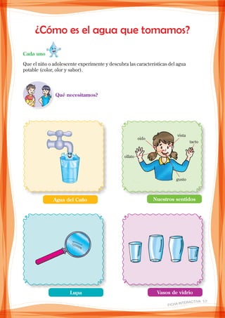 Este documento presenta una serie de fichas interactivas destinadas a enseñar a niños y adolescentes sobre el agua potable. Las fichas incluyen experimentos sencillos para que los estudiantes exploren las propiedades del agua, cómo se puede contaminar, formas de purificarla y desarrollar hábitos de consumo responsable. El objetivo general es crear conciencia sobre la importancia de cuidar el agua y prevenir su contaminación.